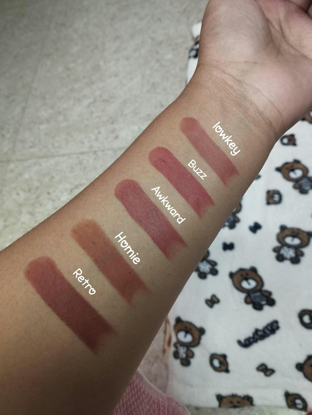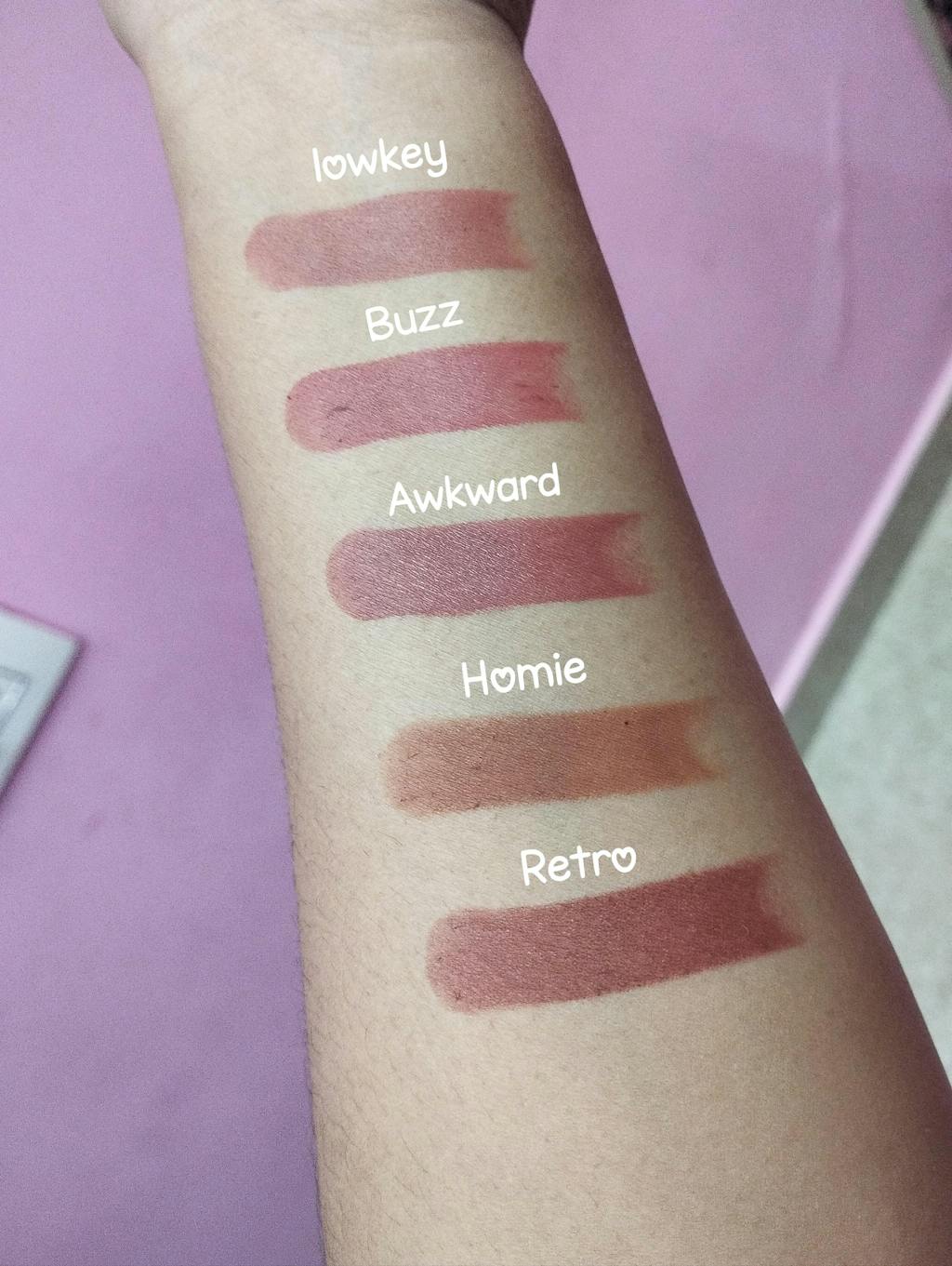 I got them in lowkey,buzz, awkward,retro and homie , perfect shades for brown girlies, beautiful packing, it has magnetic cap , glides smoothly on the lips , gives a matte finish, doesn't show lip crease lines, it is very hydrating , doesn't dry the lips, perfect for everyday use, reapply whenever needed, such cute shades will suit every skin tones ,pair it up with fae lip liners , loveeee them , happy shopping from fae , fae never disappoints 🩷🩷🩷✨✨✨✨